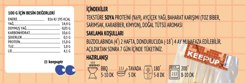 İçindekiler: Tekstüre soya proteini, ayçiçek yağı, baharat karışımı (toz biber, sarımsak, karabiber, kimyon), doğal tütsü aromas